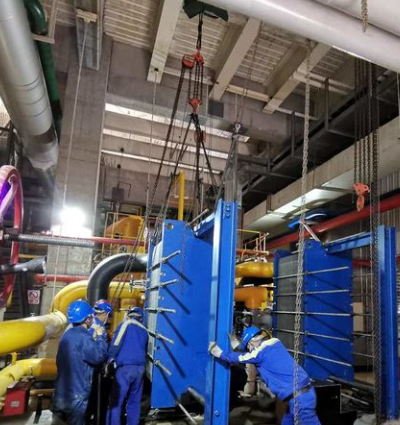 在大型板式交換器的維護(hù)和清理過程中,更換主機冷油器板片是一項重要的工作。由于這些板片通常較重,因此工人會使用手拉葫蘆來輔助進(jìn)行主機冷油器零部件的拆卸和起吊工作。